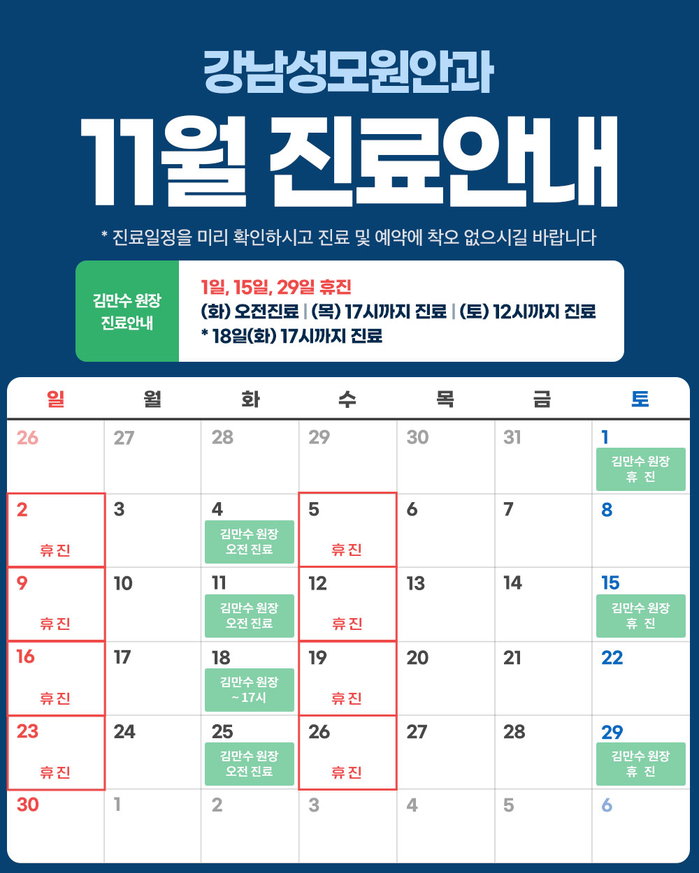 강남성모원안과 11월 원장님 휴무일정 안내 > 공지사항