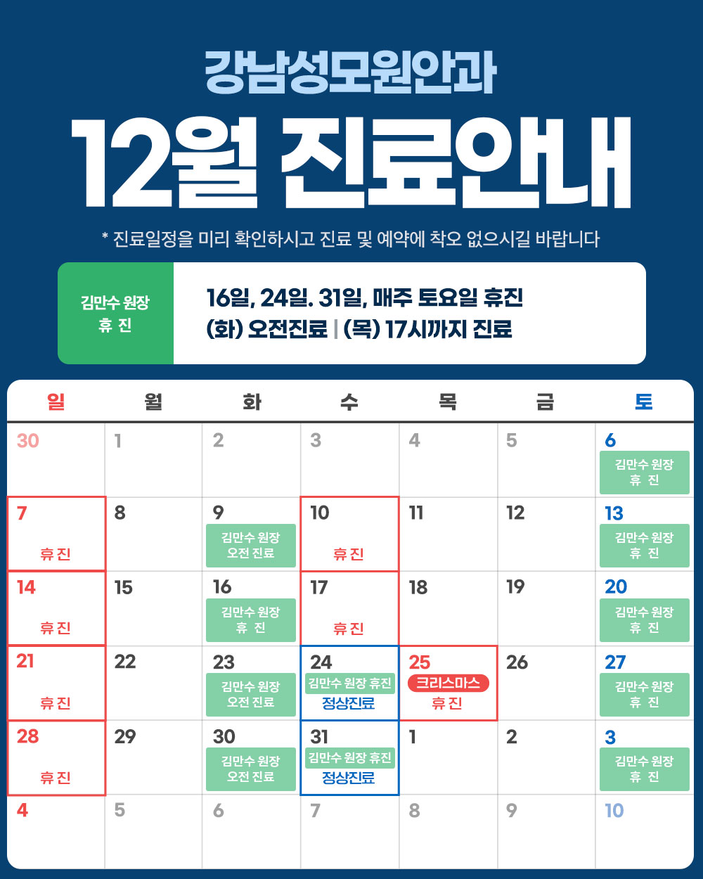 강남성모원안과 12월 원장님 휴무일정 안내